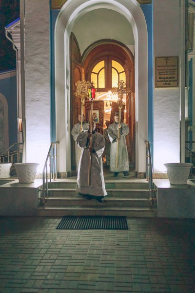 Все богослужение этого праздника проникнуто чувством радости о Воскресшем Христе. До полуночи священнослужители облачаются во весь светлейший сан. Перед самой полуночью торжественный колокольный благовест возвещает о наступлении Светоносного Праздника Воскресения Христова. Священнослужители с крестом, светильниками и каждением исходят из алтаря и обходят вокруг собора с пением «Воскресение Твое, Христе Спасе, Ангели поют на небесех, и нас на земли сподоби чистым сердцем Тебе славити». Шествие останавливается у затворенных западных врат храма, и здесь впервые архиерей возглашает радостную песнь: «Христос воскресе из мертвых, смертию смерть поправ, и сущим во гробех живот даровав».