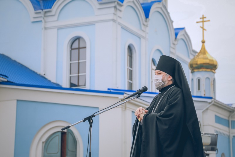 Далее на Соборной площади города Шахты открыл праздничное мероприятие правящий архиерей Шахтинской епархии Преосвященнейший епископ Симон. Архипастырь обратился к семьям, пришедшим на праздник: