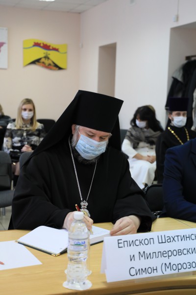 В режиме онлайн связи в заседании приняли участие епископ Шахтинский и Миллеровский Симон, глава Администрации г. Шахты Андрей Ковалев, заместитель главы Администрации Ольга Тхак, председатель религиозного отдела образования епархии протоиерей Сергий Яценко и директора общеобразовательных школ г. Шахты.