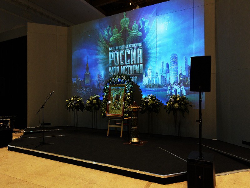 В центральный зал Манежа на время проведения выставки принесен список Владимирской иконы Божией Матери. Глава государства и Предстоятель Русской Православной Церкви поставили свечи у чудотворного образа и поклонились святыне.