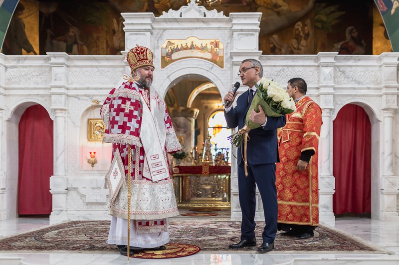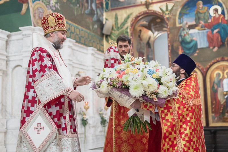 Настоятель кафедрального собора иерей Александр Теличкин от лица духовенства поздравил архипастыря с днем тезоименитства и преподнес ему букет.