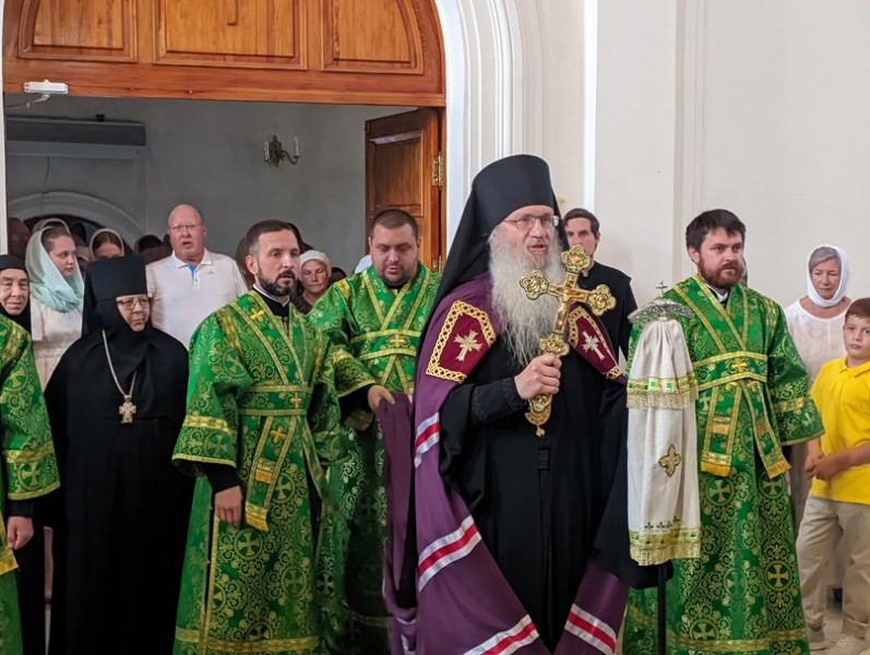 После молитвы владыка Елисей поблагодарил владыку Симона за совместное богослужение и на молитвенную память преподнес архипастырю образ преподобной Арсении и обратился к духовенству и паломникам с архипастырским словом.
