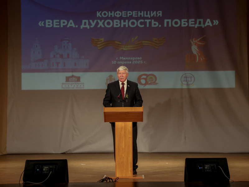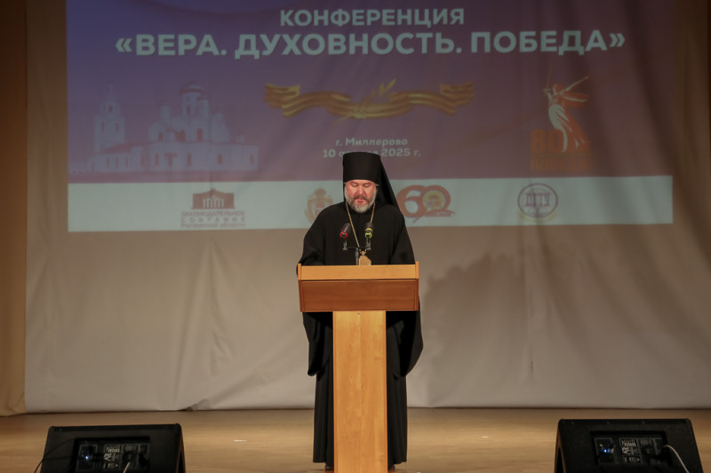 Итоговая конференция Чтений «Вера. Духовность. Победа» открылась традиционной молитвой «Царю Небесный», исполненной епархиальным духовенством и подхваченной многими в зале, вместившем 360 участников. Знамённая группа кадет внесла в зал флаги России, Ростовской области и Миллеровского района, был исполнен Государственный гимн РФ.