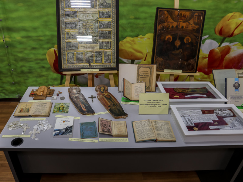 На выставке был представлен ряд святынь: частицы Горы Голгофы, дуба Мамврийского, дерева Закхея в Иерихоне, печати кустодии из Храма Гороба Господня в Иерусалиме, старинные иконы, написанные в Палестине в XIX веке, церковные книги XIX века с паломническими благословенными печатями, паломнические реликвии и благословения Палестины и Афона рубежа XIX–XX вв. Также были презентованы научные монографии старшего преподавателя ИСОиП (филиала) ДГТУ, древлехранителя Шахтинской епархии И.Г. Шаркова и старшего преподавателя ИСОиП (филиала) ДГТУ Л. Б. Томилиной «Донской и Екатеринославский отделы Императорского Православного Палестинского Общества в конце XIX – начале XX веков: социокультурная и просветительская деятельность на Юге Российской империи» и «Социокультурная, просветительская и организационная деятельность отделов и уполномоченных Императорского Православного Палестинского Общества на Юге Российской империи в конце XIX – начале XX вв.» И. Г. Шаркова, ставшая итогом фундаментальных исследований двух лет в рамках грантового конкурса ИППО – Российский Центр научных исследований. Интерес гостей вызвали Путеводитель по Святой Земле одесского издания 1894 года с благословением игумена Свято-Ильинского подворья в Одессе, постриженника Ильинского скита на Афоне отца Вениамина (Тузова-Стрельченко) рабе Божией Е. П. Василенко, паломнице в Палестине, члену ИППО, впоследствии игумении Знаменского монастыря Екатеринославской епархии Елисавете, а также письма иерархов из Иерусалима и Вифлеема позапрошлого столетия и старинный аналойный крест из перламутра палестинской работы. Старинные церковные книги и документы, свидетельствующие о связях России со Святой Землёй, заинтересовали школьников и студентов, их преподавателей, посетивших выставку и Чтения.