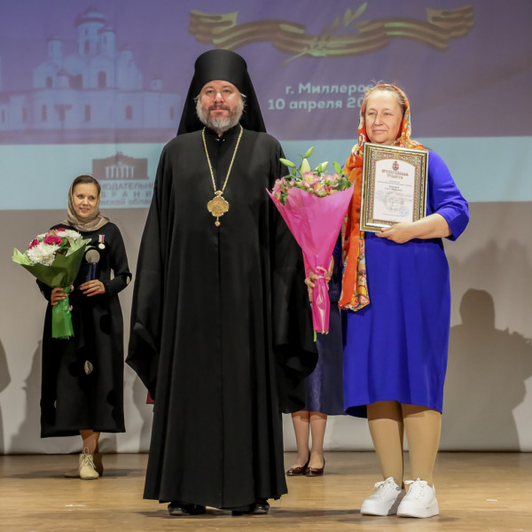 Завершением официальной части стало вручение наград. Преосвященнейший епископ Шахтинский и Миллеровский Симон во внимание к трудам на благо Святой Церкви, за особые труды в деле духовно-нравственного образования и воспитания вручил медаль Шахтинской епархии «Священномученика Александра Команского» III степени преподавателю русского языка и литературы Вёшенского педагогического колледжа им. М.А. Шолохова Людмиле Егоровне Ивановой, преподавателю воскресной школы при храме великомученика Пантелеимона города Миллерово Наталье Юрьевне Джугановой, преподавателю воскресной школы при храме святителя Николая Чудотворца станицы Обливской Галине Васильевне Титоренко; а также во внимание к трудам на благо Святой Церкви, за особые труды в деле духовно-нравственного образования и воспитания, Архиерейские грамоты – преподавателю Донецкого промышленно-гуманитарного техникума, старшей сестре милосердия при Державном храме города Донецка Ольге Николаевне Бреусовой и руководителю воскресной школы «Светоч» при храме Донской иконы Божией Матери города Новошахтинска Инне Викторовне Саханиной.