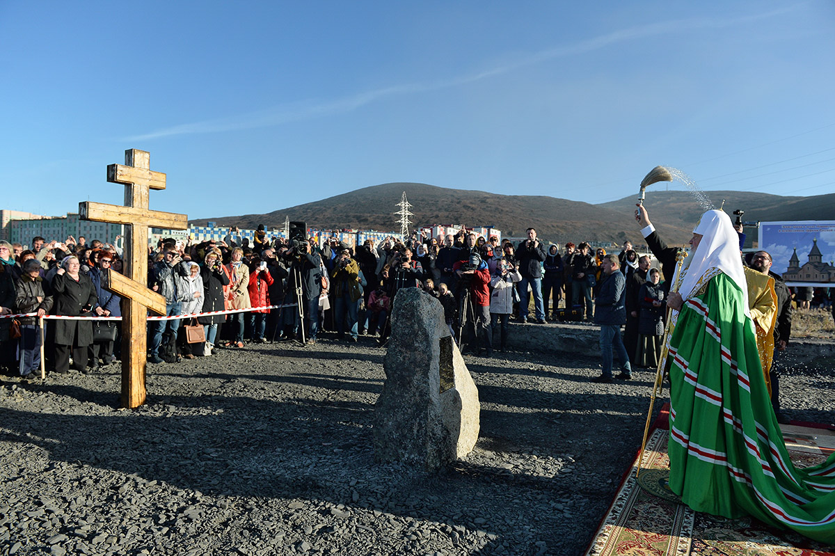 Святейший Патриарх Московский и всея Руси Кирилл совершил чин освящения закладного камня в основание храма святых Новомучеников и исповедников Церкви Русской в городе Певек на Чукотке. Деревянный храм высотой 30 метров рассчитан на 300 прихожан. Ввиду вечной мерзлоты храм будет построен на сваях.