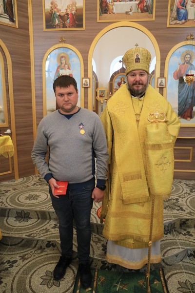 Совершив богослужение, Преосвященнейший владыка обратился с амвона к духовенству и мирянам с архипастырским словом, поблагодарил благотворителей и строителей за созидание и благоукрашение нового храма. Всем потрудившимся в деле строительства епископ Симон вручил благодарственные письма, а главного попечителя архиерей наградил епархиальной медалью «За заслуги перед Шахтинской епархией».