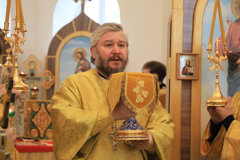 Перед причастием с проповедью о жизни и духовных подвигах святителя Иоанна Златоуста обратился священник Сергий Болоцков.