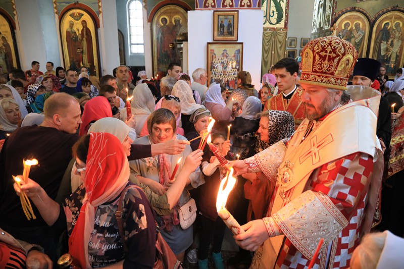 Благодатный огонь, доставленный из Иерусалима, Преосвященнейший епископ Симон раздавал верующим по окончании богослужения. Каждый из прибывших в собор зажигал свои свечи и негасимые лампадки, чтобы отнести Святой огонь в свои дома для освящения жилищ и сохранить память о Божием чуде.