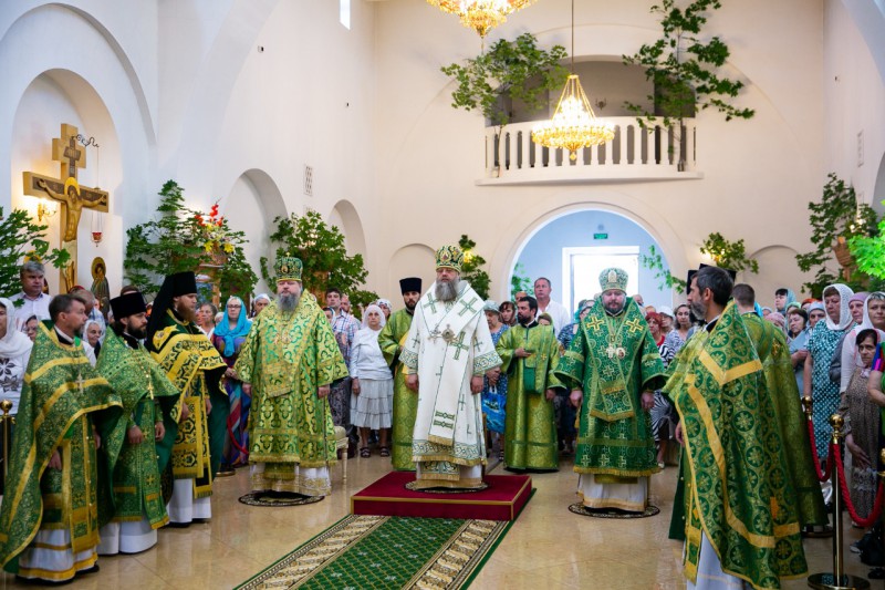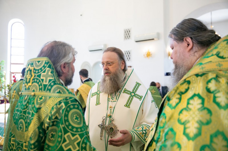17 июня 2019 года, в День Святого Духа, в Троицком храме Свято-Иверского женского монастыря Ростова-на-Дону Божественную литургию совершили митрополит Ростовский и Новочеркасский Меркурий, епископ Волгодонский и Сальский Корнилий, епископ Шахтинский и Миллеровский Симон.
