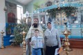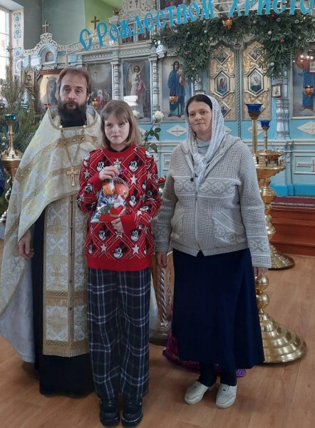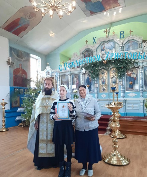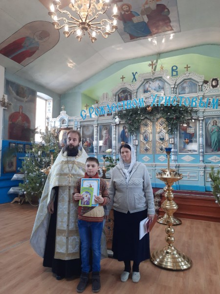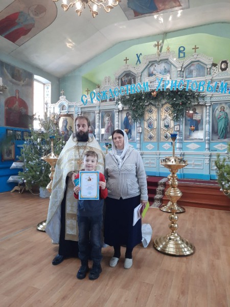 В святочные дни, благочинный приходов Нижнедонского округа протоиерей Сергий Яценко наградил учащихся церковно - приходской воскресной школы "Благовест" храма Архистратига Михаила п. Каменоломни Октябрьского района за участие в детских районных, областных и епархиальных художественных конкурсах и вручил дипломы.