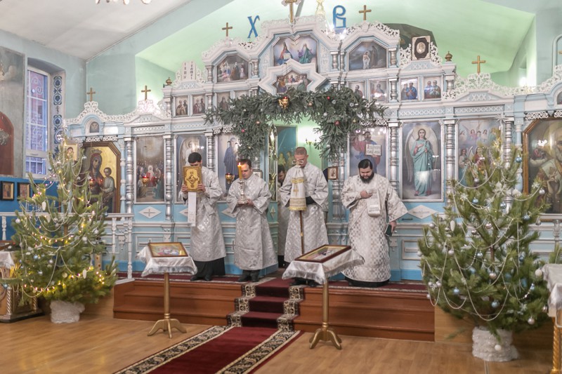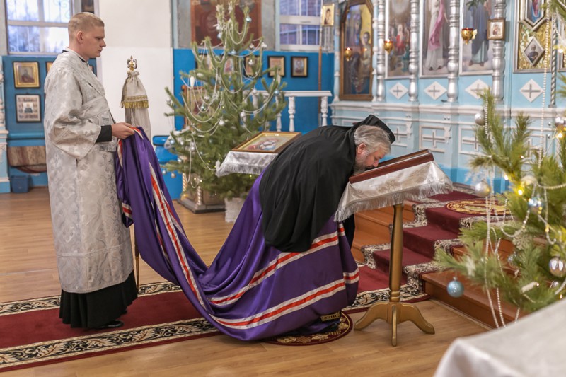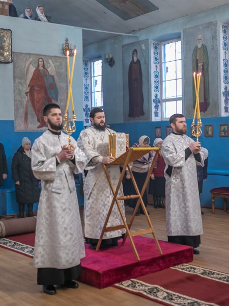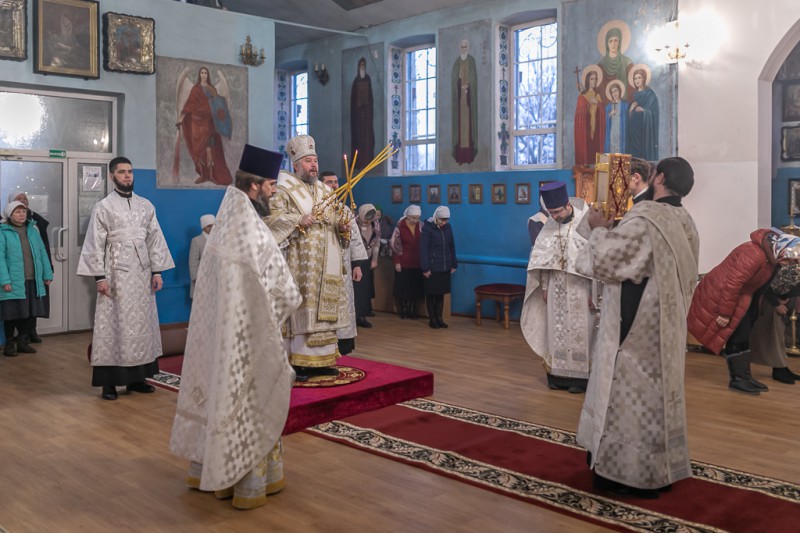 Его Преосвященству сослужили благочинный приходов Нижнедонского округа, настоятель храма протоиерей Сергий Яценко, клирик Вознесенского храма г. Шахты иерей Виталий Крендясов, клирик храма Архистратига Михаила диакон Максим Коваленко и клирик Покровского кафедрального собора г. Шахты диакон Трофим Осяк.