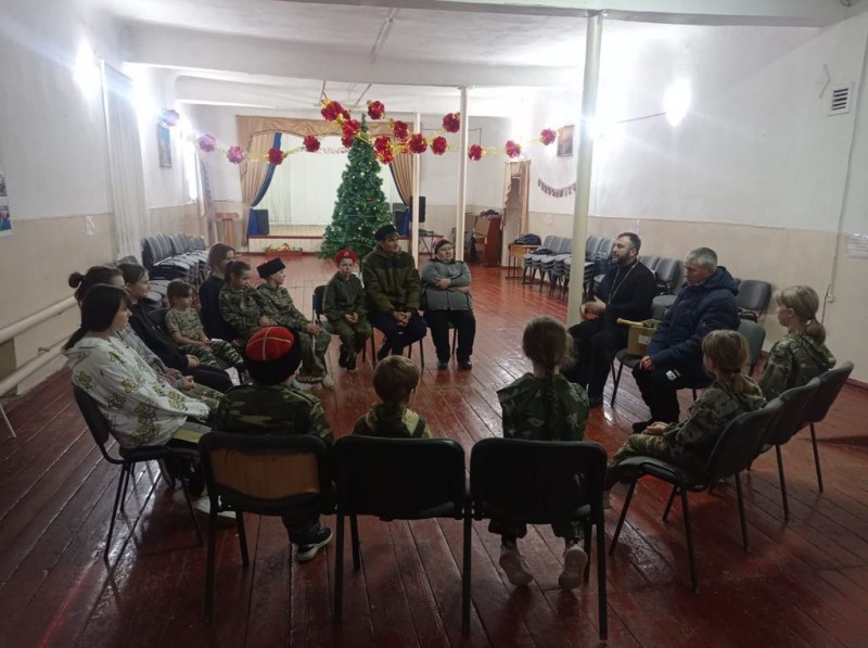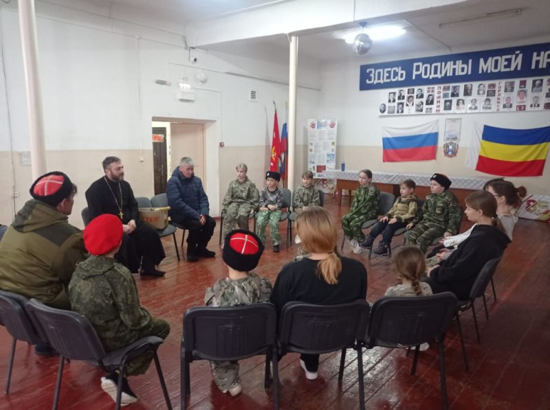 Настоятель храма Великомученика Георгия Победоносца поселка Новозарянский иерей Сергий Липень, в рамках работы с казачеством и молодежью, встретился с воспитанниками казачьей молодежной организации «Донцы».
