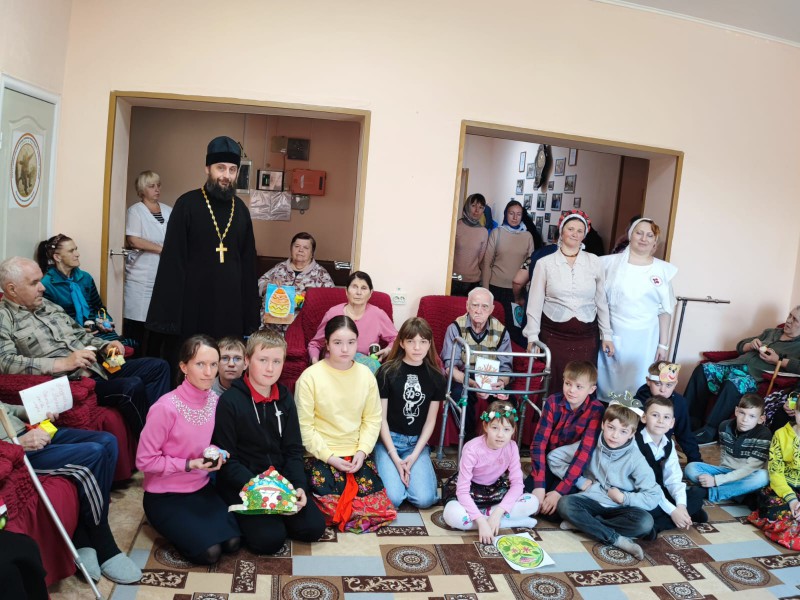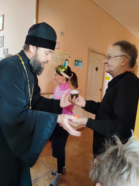 В день Великого праздника- Воскресения Христова, благочинный приходов Нижнедонского округа протоиерей Сергий Яценко, учащиеся церковно - приходской воскресной школы "Благовест" и сестры милосердия Марфо-Мариинского сестричества храма Архистратига Михаила п. Каменоломни Октябрьского района поздравили постояльцев Центра социального обслуживания граждан пожилого возраста и инвалидов с пасхальным торжеством.