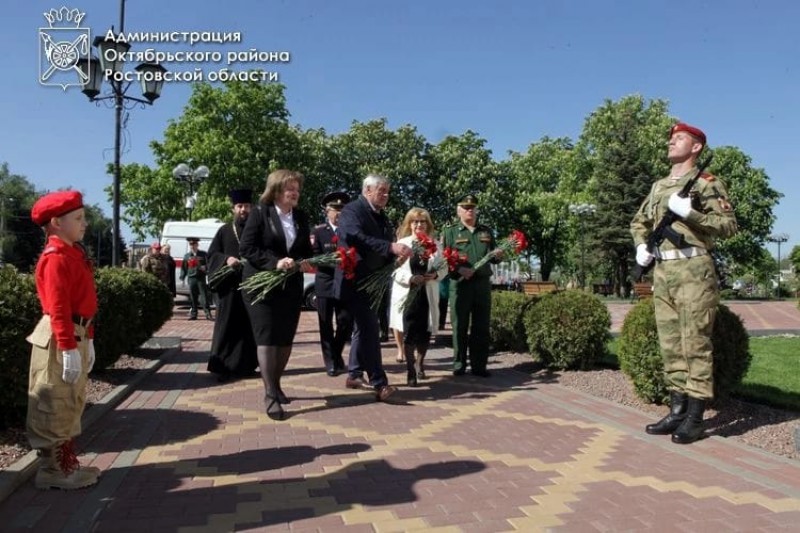 В торжественном мероприятии приняли участие Председатель Собрания депутатов-глава Октябрьского района Е.П.Луганцев, глава Администрации Октябрьского района Л.В. Овчиева, военный комиссар по г. Шахты и Октябрьскому району И.И.Вансович, благочинный приходов Нижнедонского округа протоиерей Сергий Яценко, председатель Октябрьского районного суда И.И.Иванчикова, начальник ОП №3 МУ МВД РФ "Новочеркасское", почетные граждане Октябрьского района Е.И.Каргина, Н.Д.Бессарабов, председатель районной общественной организации «Союз Чернобыль» М.М.Харитонов, заместители главы Администрации Октябрьского района, представители общественных организаций, военнослужащие, юнармейцы.