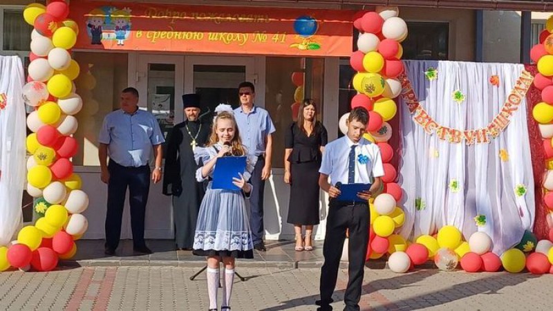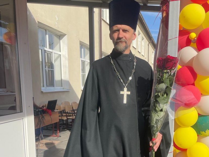 На торжественной линейке с поздравлениями и напутственными словами выступили директор школы и почетные гости, среди которых настоятель храма святителя Алексия Московского протоиерей Андрей Поздняков.