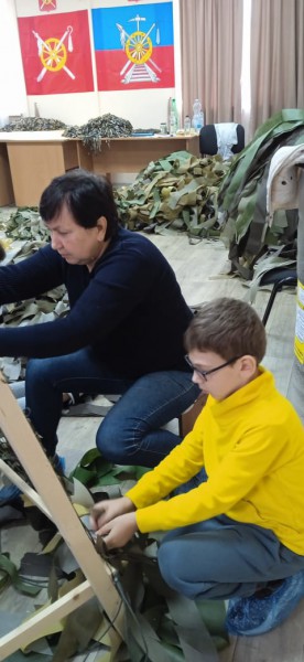 Сестры Марфо - Мариинского Сестричества, молодёжный актив семейного клуба "Верность" и воспитанники старшей группы церковно - приходской воскресной школы "Благовест" храма Архистратига Михаила п. Каменоломни совместно с учителями и родителями в свое свободное время собираются в мастерскую и совместно с волонтёрами района плетут маскировочные сети.
