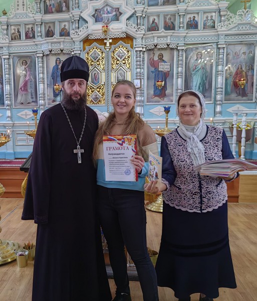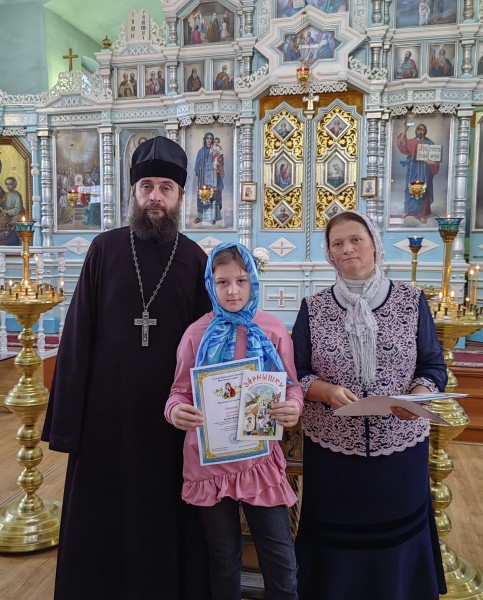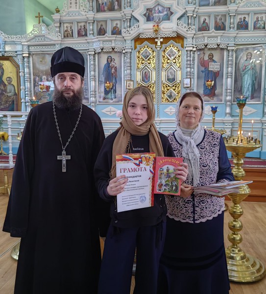 Настоятель храма, благочинный приходов Нижнедонского округа протоиерей Сергий Яценко, поздравил учащихся воскресной школы и воспитанников социального приюта для детей и подростков Октябрьского района "Огонек", активно принявших участие в конкурсе, подарил каждому ребёнку подарок и пожелал дальнейших творческих успехов.
