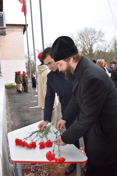 В своем обращении к участникам торжественной встречи, протоиерей Сергий Яценко, напомнил, что совершенно особое место как в истории, так и в памяти соотечественников занимают имена людей, в разные эпохи доблестно защищавших Родину, живших и трудившихся ради ее процветания. Таких людей называют героями, их память трепетно чтят, а их подвиг увековечивается не только на страницах учебников по истории, но и в названиях городов, улиц, промышленных предприятий, учреждений культуры и образовательных учреждений.