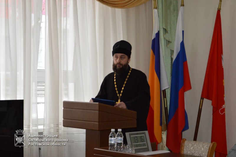 Благочинный приходов Нижнедонского округов протоиерей Сергий Яценко рассказал взаимодействии приходов благочиния и казачьих духовников с казаками казачьего общества «Нижнедонской Юрт» окружного казачьего общества Первого Донского округа войскового казачьего общества «Всевеликое войско Донское».