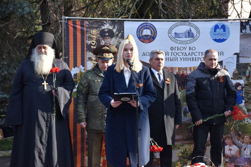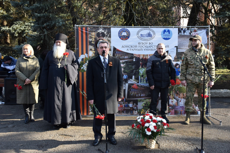 Открыл митинг ректор Донского ГАУ, профессор Владимир Федоров, который от имени коллектива вуза поздравил ветеранов и гостей праздника. Он отметил, что отказ от исторической правды, попытки переписать историю и предать забвению память миллионов привели к тому, что России вновь приходится защищать и спасать людей – на этот раз от современного нацизма.