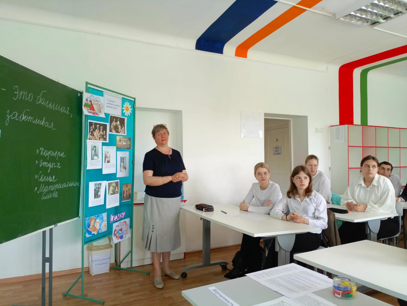 Учитель Козина Надежда, рассказала о роли семьи в современном обществе. Особое внимание обратила на то, что семья является источником любви, понимания и поддержки, именно возле семейного очага каждый учится быть добрым, честным и справедливым. На семьях держится общество, государство, мир. Ради семьи хочется жить, добиваться высоких результатов. На уроке старшеклассники сами составляли «рецепт семейного счастья».