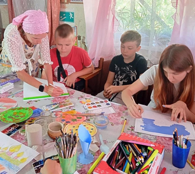 Ребята воскресной школы, пишут письма поддержки и рисуют детские рисунки.