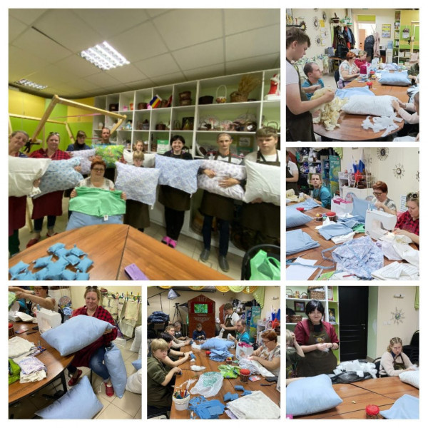 Дети - инвалиды при поддержке взрослых, сделали своими руками подушки и постельное белье для военнослужащих, находящихся на лечении в госпитале и передали сестрам Марфо - Мариинского Сестричества храма Архистратига Михаила п. Каменоломни.