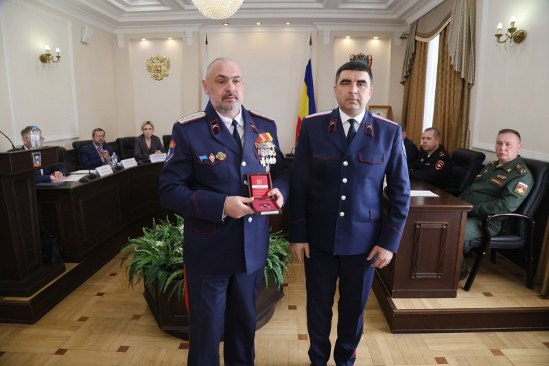 Началось мероприятие с церемонии вручения знаков губернатора Ростовской области «За ратную службу» казакам-участникам СВО Дмитрию Пешкову и Роману Сыропятову.