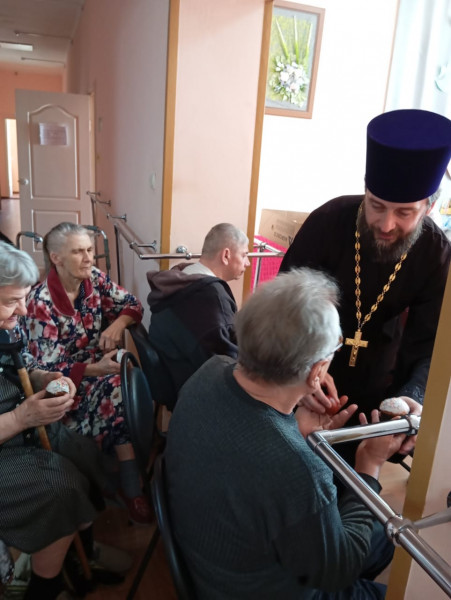 Благочинный приходов Нижнедонского округа протоиерей Сергий Яценко совместно с учащимися церковно-приходской воскресной школы «Благовест» храма Архангела Михаила пос. Каменоломни Октябрьского района в великий праздник Светлого Христова Воскресенья посетили Центр социального обслуживания граждан пожилого возраста и инвалидов.