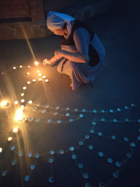 Участники акции выложили из свечей изображение в виде голубя – «символ мира». Картины объединяет общий лозунг – «Помним».