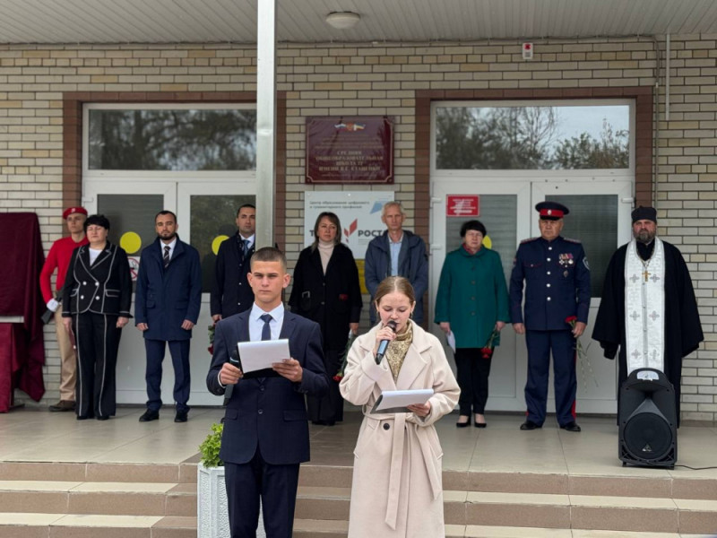 В станице Кривянской состоялось значимое событие — митинг, посвященный открытию обновленной мемориальной доски в честь Героя Советского Союза, ветерана Великой Отечественной войны Василия Ефимовича Стаценко, чье имя носит школа № 72.