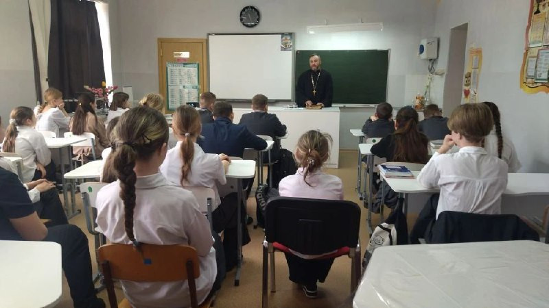 В преддверии Дня православной книги в школе № 5 имени А. О. Хорошевской поселока Новозарянский, Октябрьского района прошла встреча учащихся с настоятелем местного храма святого великомученика Георгия Победоносца иереем Сергием Липень.