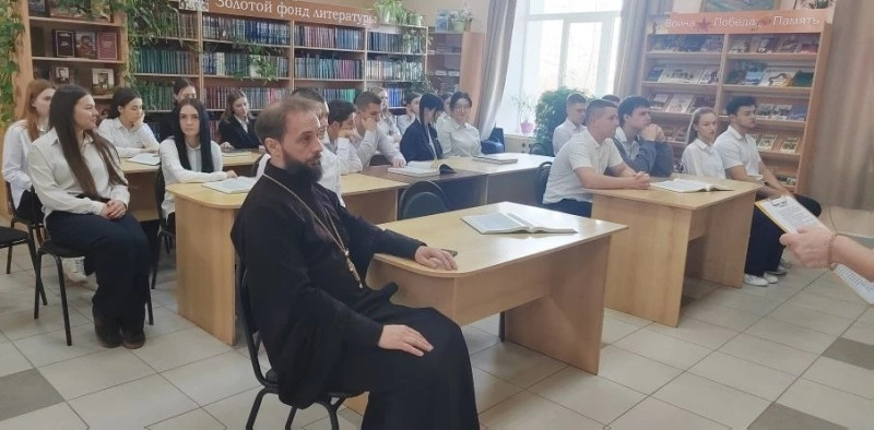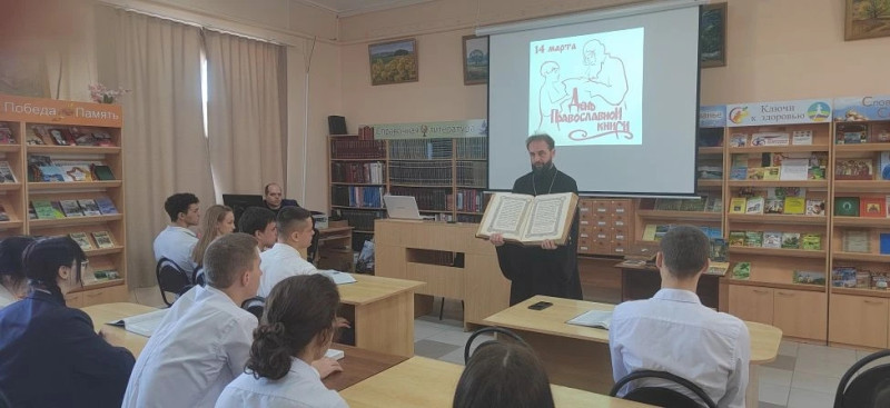 В Центральной районной библиотеке поселка Каменоломни состоялась встреча учащихся старших классов Лицея № 82 им. А. Н. Знаменского с благочинным приходов Нижнедонского округа протоиереем Сергием Яценко. Мероприятие было приурочено к теме, объединяющей историю, культуру и православные традиции, — «Духовные книги — книги о главном».