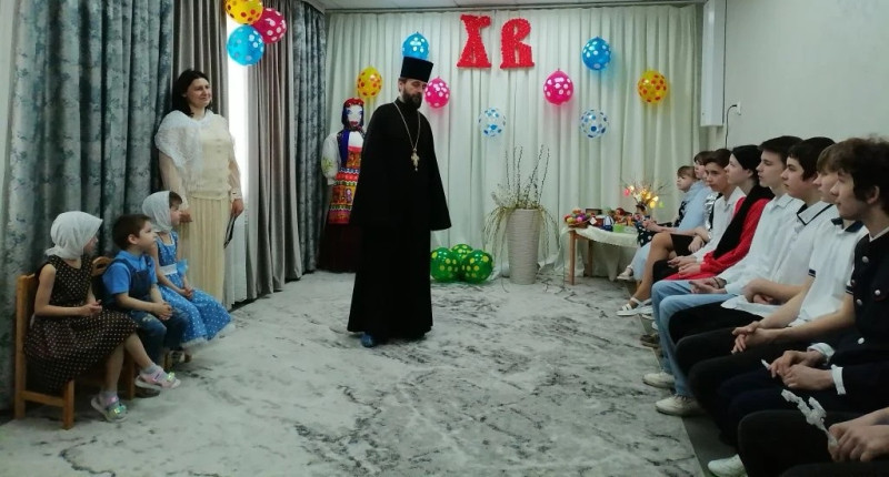 Гости готовят для ребят небольшое театрализованное представление, вместе участвуют в концертных номерах, а затем присоединяются к поздравлениям отца Сергия и вручают воспитанникам приюта сладкие пасхальные подарки.