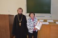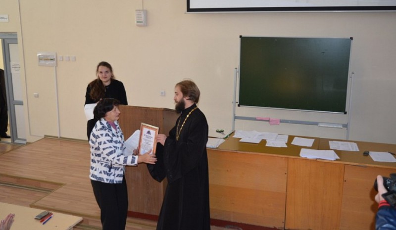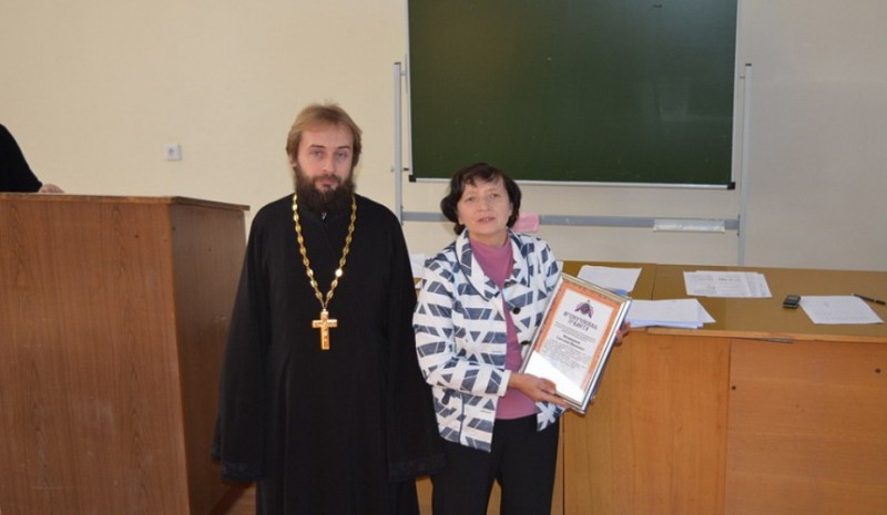 По окончании проведения регионального тура открытой Всероссийской интеллектуальной олимпиады «Наше наследие», прошедшей в Институте сферы обслуживания и предпринимательства г.Шахты (филиала) Донского государственного технического университета, председатель Отдела религиозного образования протоиерей Сергий Яценко от имени епископа Шахтинского и Миллеровского Симона вручил Архиерейскую грамоту учителю высшей категории средней школы № 23 поселка Красногорняцкий Октябрьского района Нижнедонского благочиния, методисту Муниципального автономного учреждения "Информационно-методический кабинет" - Светлане Ивановне Мумиковой.