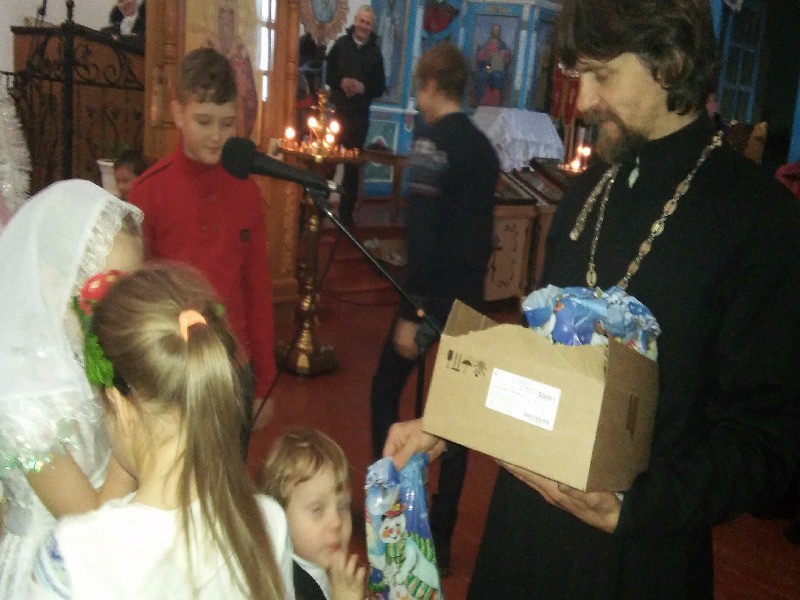 Праздничным поздравлением и выступлением порадовали местных жителей и учащиеся местной школы. Настоятель прихода протоиерей Андрей Поздняков поздравил ребят с праздником, поблагодарил за выступление и подарил сладкие подарки.
