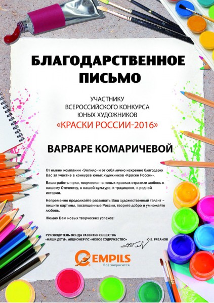 « Конкурс – мотивация к творчеству, к усердию, к созиданию, а еще это школа смирения и школа любви: мы учимся радоваться радости друг друга, не только своей; учимся изживать эгоизм и тщеславие, а иначе о каком добре идет речь? Все подлинное, настоящее обретается через усилие, усердие, труд и терпение» - так искренне, с сердечными пожеланиями добра, поздравили организаторы Всероссийского конкурса юных художников «Краски России-2016».