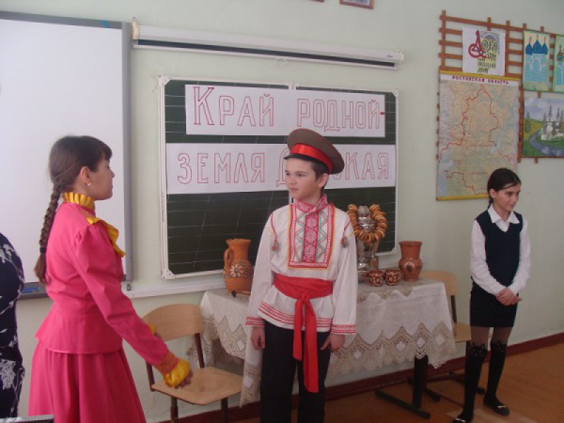 В ходе мероприятия «Наш край Донской – крупиночка России…», которое подготовили и провели учитель истории Кислица И.В. и ст.вожатая Задонская Е.Ю., учащиеся 6-7 классов смогли совершить увлекательное путешествие по Ростовской области от момента ее основания до наших дней. Началось путешествие с просмотра фильма «Россия – это мы! Выдающиеся люди Ростовской области», а продолжилось в гостях у донского казачества. Ребята поговорили о возникновении казачества на Дону, а также узнали об особенностях воспитания, быта, традициях донских казаков.