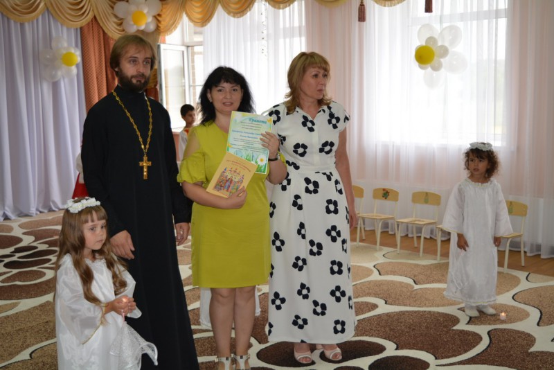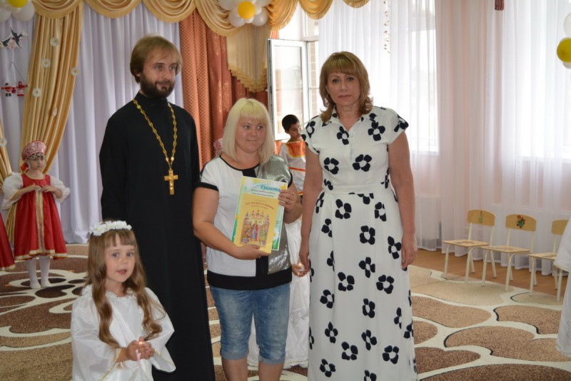 В рамках праздничных мероприятий руководитель детского сада Любовь Витальевна Дорошенко совместно с благочинным приходов Нижнедонского округа протоиереем Сергием Яценко наградила многодетные семьи Благодарственными письмами и памятными подарками.