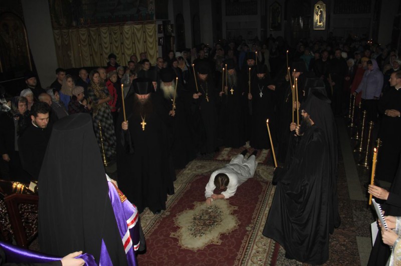 По расстеленной дорожке в храме постригаемый в знак своего смирения и покаяния от западной части, распинаясь, прополз к амвону. Монашеская братия епархии прикрывала постригаемого мантиями, пока тот полз к амвону и потом давал монашеские обеты.