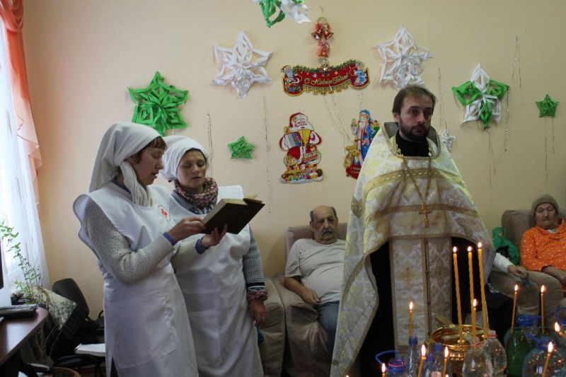 В великий праздник Крещения Господня, благочинный приходов Нижнедонского округа протоиерей Сергий Яценко, по просьбе подопечных социально реабилитационного отделения при МУ «Центр социального обслуживания граждан пожилого возраста и инвалидов» Октябрьского района совершил чин великого освящения воды.