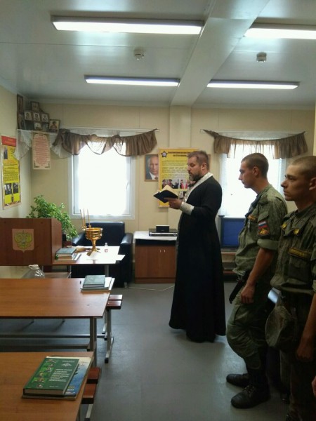В одно из своих посещений духовник воинской части № 22265 иерей Евгений Поцелуев по просьбе командования совершил освящение жилого помещения одного из подразделений 150-й мотострелковой дивизии. После освящения была проведена беседа с военнослужащими.