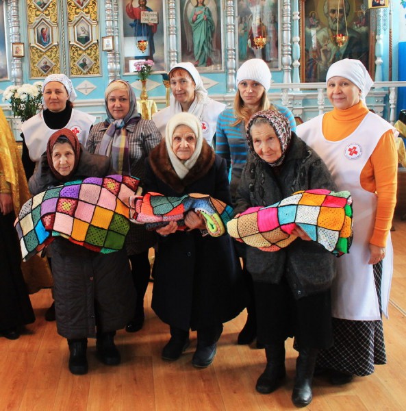 Пледы изготовленые из маленьких вязанных квадратиков, были собраны от всех желающих принять участие в этой акции. Пожилым прихожанкам храма были переданы подарки представителями творческого объединения, которые организовали эту акцию, выразив свое желание подарить тепло сердец всех неравнодушных людей.