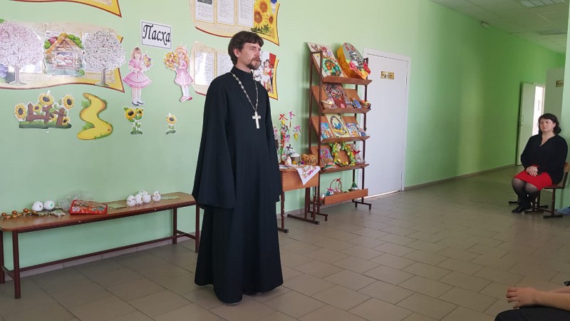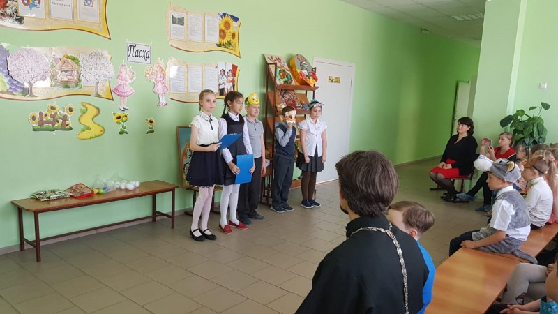 Священник поздравил всех учащихся и учителей с праздником Пасхи. В завершение встречи отец Андрей подарил ребятам пасхальные подарки.