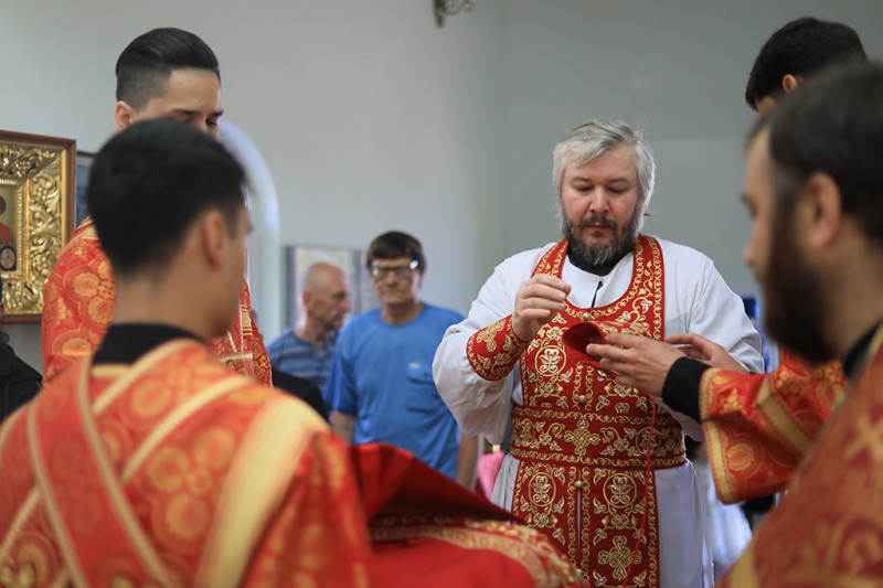 Его Преосвященству сослужили благочинный приходов Нижнедонского округа протоиерей Сергий Яценко, настоятель храма святого Георгия иерей Сергий Липень, иеродиакон Флавиан (Васильев).