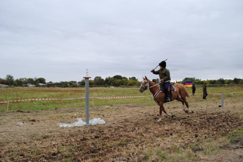 Состязания проводились по двум направлениям: пешая и конная рубка шашкой. Рубят пластиковые бутылки с водой на четыре-пять частей, при этом бутылка не должна упасть на землю. Разделаться с прутьями и веревками тоже нужно не просто так. Судья учитывает технику нанесения удара и количество частей.