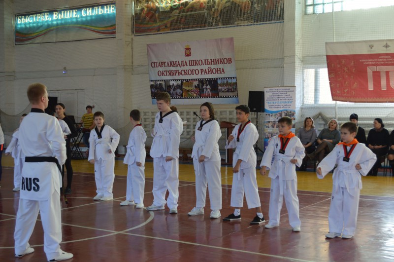 Перед собравшимися выступили спортсмены секции тхэквондо Октябрьского района, которые совсем недавно сдали аттестацию в рамках проекта «Спорт без границ» и получили белые пояса (некоммерческая организация «Доброта от сердца к сердцу», руководитель К. Игнатова).