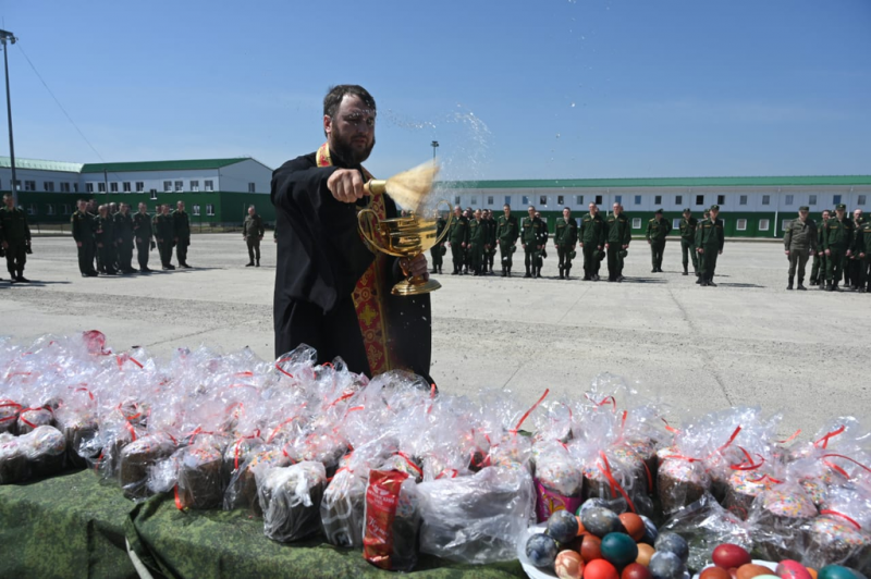 Священник вместе с военнослужащим помолился, а затем освятил пасхальные куличи.
