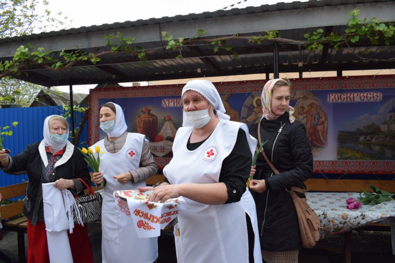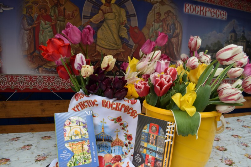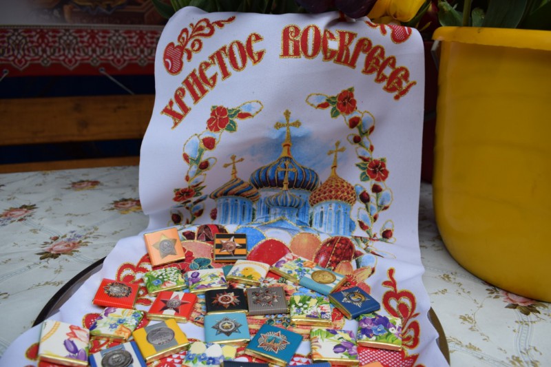 Среди прихожан немало тех, чье детство пришлось на военное время. В знак уважения сестры милосердия Марфо - Мариинского Сестричества и добровольцы вручили цветы и памятные подарки.